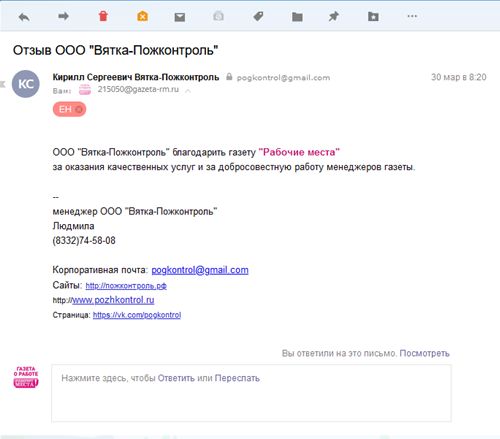 ООО "Вятка-Пожконтроль" благодарит газету "Рабочие места"