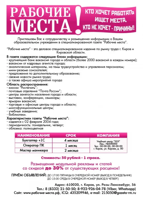 Сказать что-то негативное в отношении газеты «Рабочие места» просто невозможно. Отзывчивые менеджеры, действительно работающее издание! А что еще необходимо для длительного и полноценного сотрудничества?